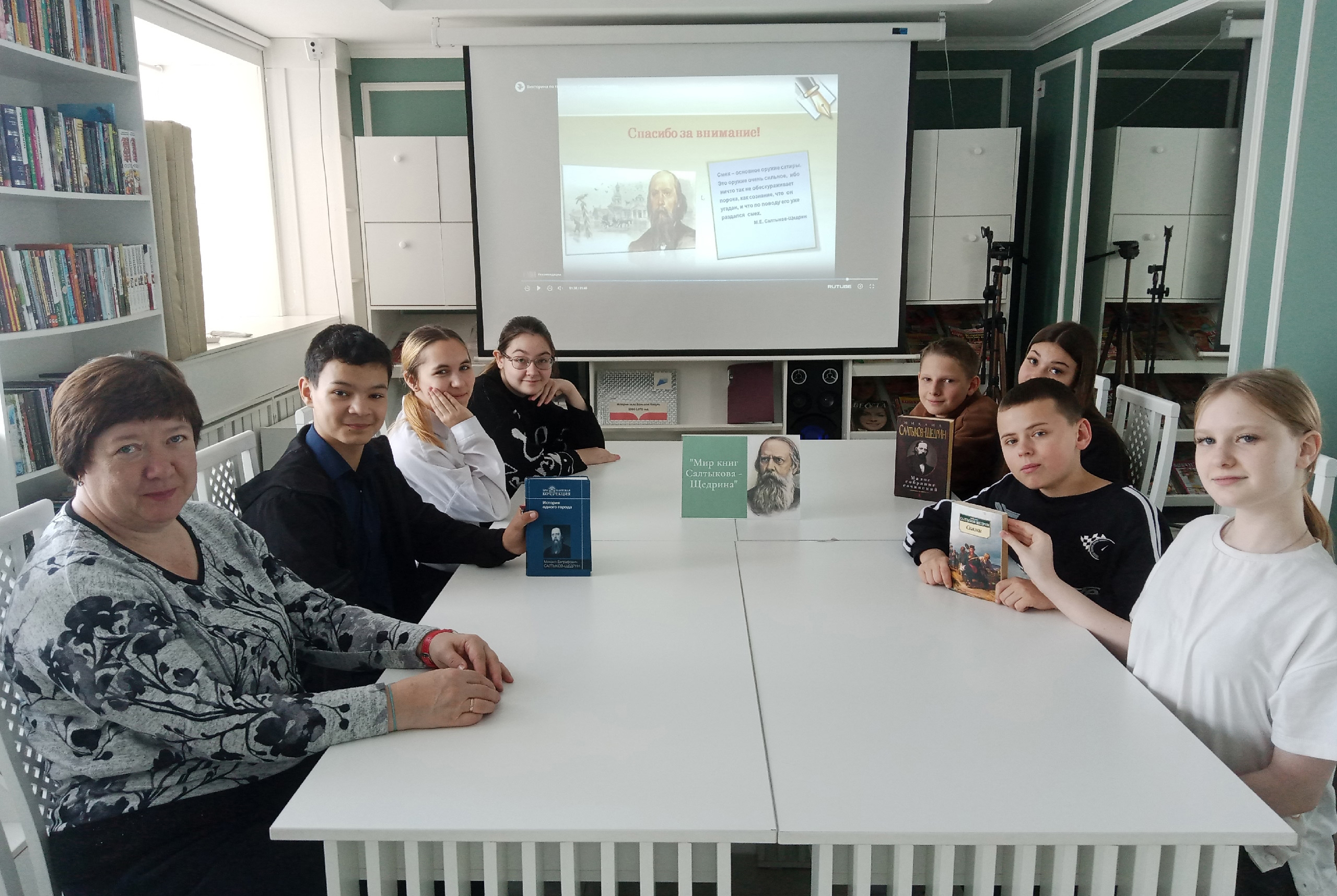 По завершению викторины школьники не спешили расходиться, а с интересом знакомились с книгами, представленными на выставке-портрете «Мир книг Салтыкова-Щедрина».