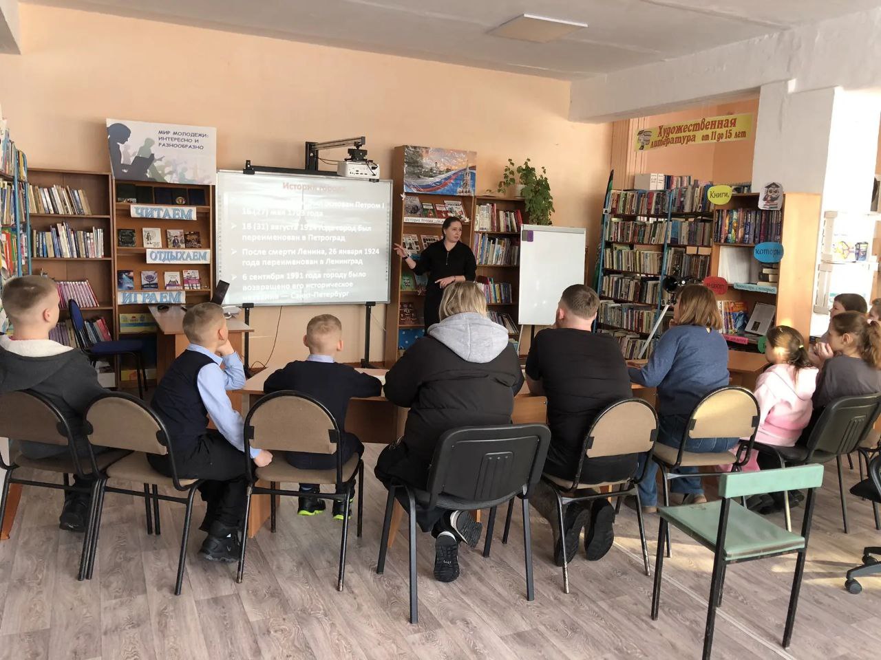 Библиотекарь прочитала отрывок из повести Михаила Сухачева «Дети блокады». Затем ребята познакомились с историями из сборника Елены Ульевой «Беседы о войне», посвященными событиям военного времени.