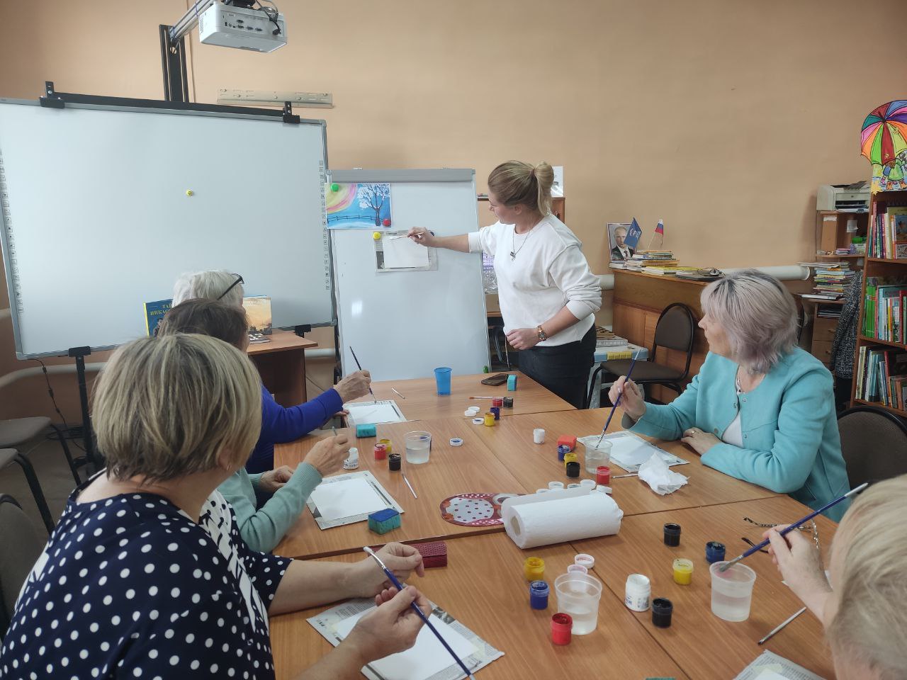 На занятии участники рисовали зимние пейзажи. Они нарисовали изгородь и дерево, которое росло за ней. Снег только что выпал, и его пушистые хлопья покрыли всё вокруг. Для рисования использовали краски, кисточки и бумагу, специальные губки, чтобы сделать фон картины. Дополняли мастер-класс тематически подобранные книги об искусстве: «Тайны Пикассо», «Мастера русских художников», «Великие художники» и «Все цвета моря». Выставка помогла лучше понять, как работают художники.