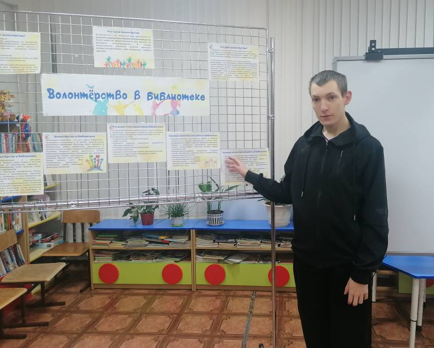 Особое внимание было уделено волонтерству в библиотеке. Ребятам рассказали, кто может стать библиотечным волонтером, и чем они могут быть полезны. Также ребят познакомили с волонтерами Юрьевской библиотеки, младшей Кристиной Прокопчик (2010 г.р.) и старшей Галиной Яковлевной Чумаковой (1949 г.р.). Они помогают в организации мероприятий для детей и взрослых, участвуют в ремонте книг, оказывают помощь в поиске нужной информации. Самый активный помощник библиотеки – Дмитрий Кабошко, немного рассказал о том, какое место в его жизни занимает волонтерство в библиотеке.