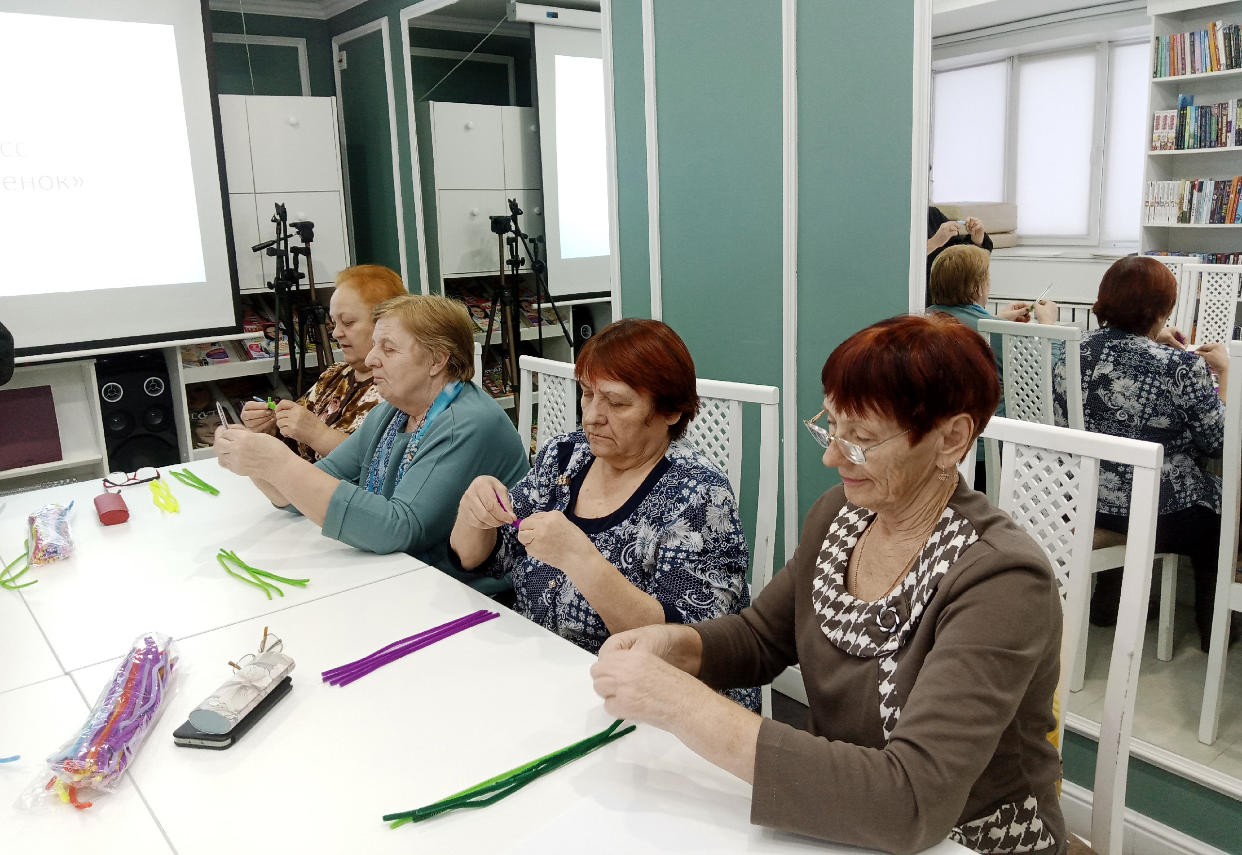 Библиотекари радушно встретили гостей и предложили женщинам золотого возраста, которые пришли не только научиться новому, но и поделиться атмосферой праздника друг с другом, окунуться в мир чудес и волшебства, приняв участие в мастер-классе «Новогодний венок» из синельной проволоки.
