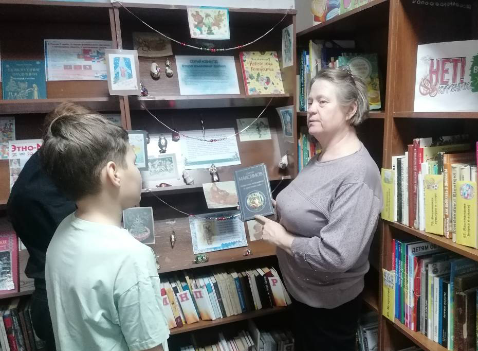 Путешествие началось с обзора выставки «Старый-старый Новый год», посвящённой старому Новому году. Библиотекарь увлекла ребят рассказом об истории праздника, познакомив их с особенностями святочных дней, полных загадок и предсказаний.