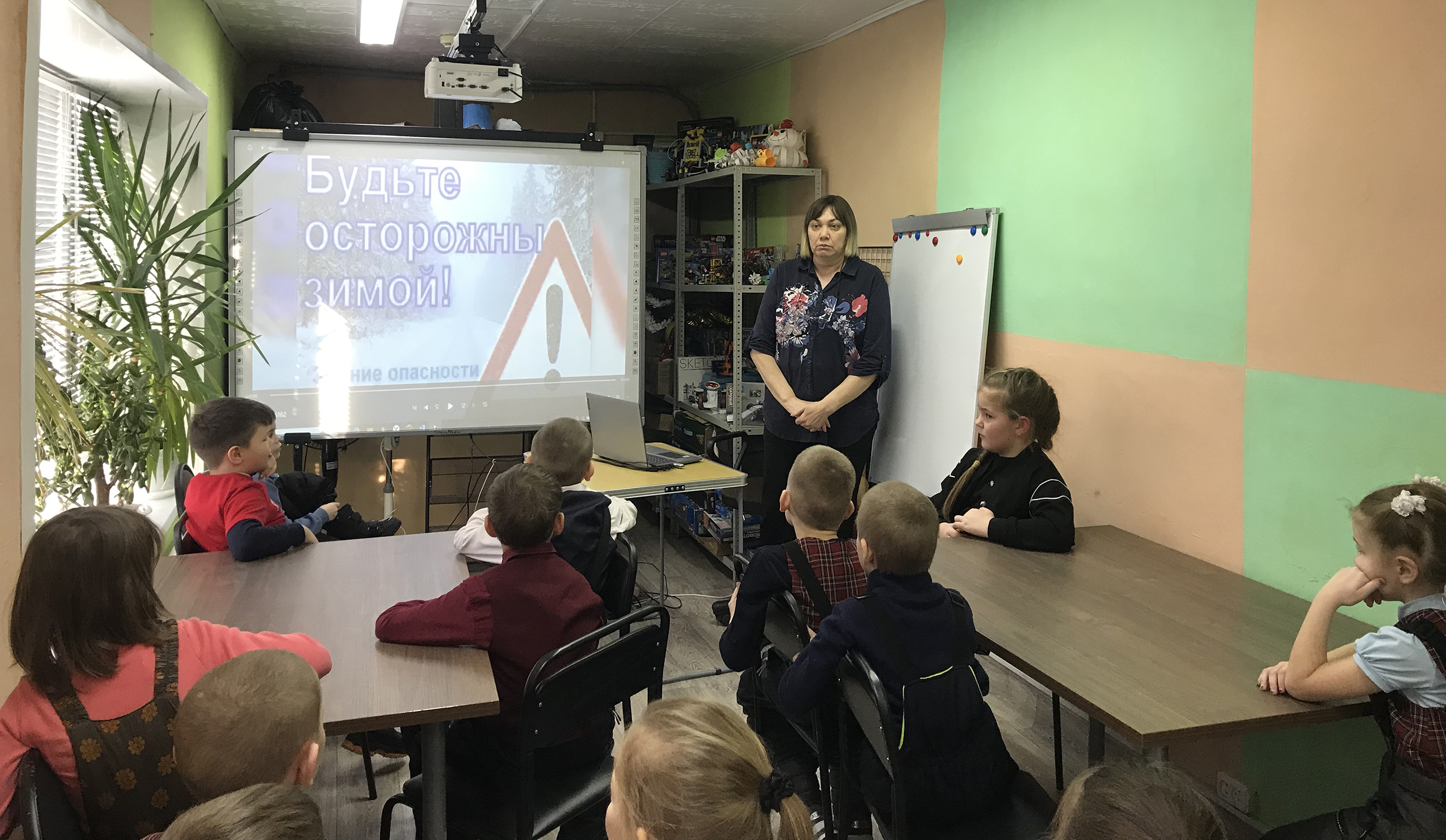 Ребята с интересом посмотрели видеофильм «Будьте осторожны зимой». Они узнали, как вести себя на тонком льду, уберечься от травм в гололёд, правильно скатываться с горки, об опасности падения снега и сосулек с крыш, как необходимо одеваться зимой, чтобы не получить обморожение. Далее были показаны мультфильмы о безопасном поведении зимой.