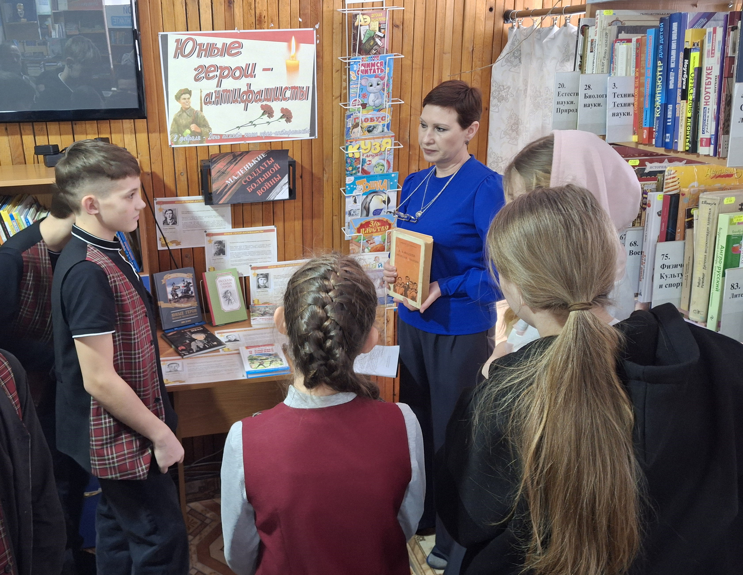 К этому мероприятию в библиотеке оформлена книжная выставка «Маленькие солдаты большой войны», около которой библиотекарь провела обзор представленных произведений художественной прозы для детей и некоторых документальных материалов о юных героях Великой Отечественной войны.
